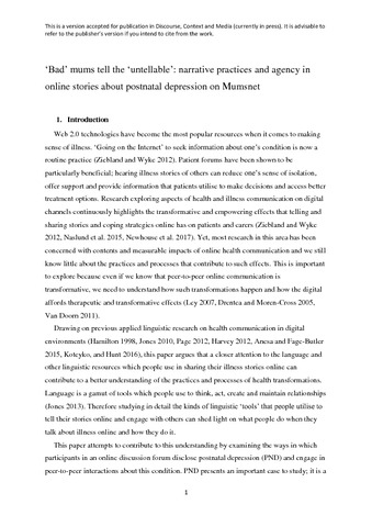 ‘Bad’ mums tell the ‘untellable’: narrative practices and agency in online stories about postnatal depression on Mumsnet.