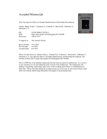 Mattos Feijó, L., Tarman, G. Z., Fontaine, C., Harrison, R., Johnstone, T. and Salomons, T. V. (2018) Sex-specific effects of gender identification on pain study recruitment. The journal of pain : official journal of the American Pain Society, 19 (2). pp. 178-185. ISSN 1526-5900 doi: 10.1016/j.jpain.2017.09.009