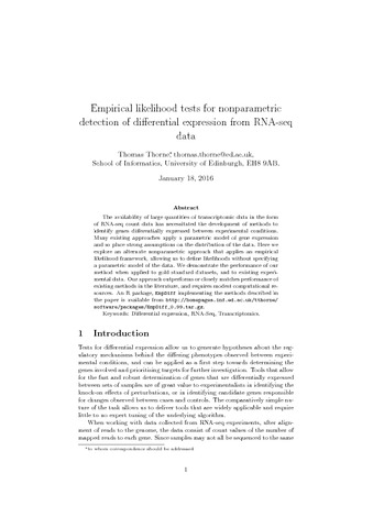 Thorne, T. (2015) Empirical likelihood tests for nonparametric detection of differential expression from RNA-seq data. Statistical Applications in Genetics and Molecular Biology, 14 (6). pp. 575-583. ISSN 2194-6302 doi: 10.1515/sagmb-2015-0095