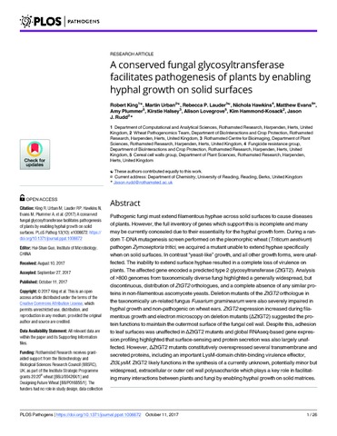 King, R., Urban, M., Lauder, R. P., Hawkins, N., Evans, M., Plummer, A., Halsey, K., Lovegrove, A., Hammond-Kosack, K. and Rudd, J. J. (2017) A conserved fungal glycosyltransferase facilitates pathogenesis of plants by enabling hyphal growth on solid surfaces. PLoS Pathogens, 13 (10). e1006672. ISSN 1553-7374 doi: 10.1371/journal.ppat.1006672
