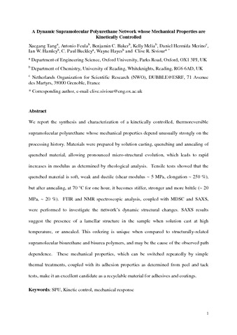 We report the synthesis and characterization of a kinetically controlled, thermoreversible supramolecular polyurethane whose mechanical properties depend unusually strongly on the processing history. Materials were prepared by solution casting, quenching and annealing of quenched material, allowing pronounced micro-structural evolution, which leads to rapid increases in modulus as determined by rheological analysis. Tensile tests showed that the quenched material is soft, weak and ductile (shear modulus ~ 5 MPa, elongation ~ 250 %), but after annealing, at 70 °C for one hour, it becomes stiffer, stronger and more brittle (~ 20 MPa, ~ 20 %). FTIR and NMR spectroscopic analysis, coupled with MDSC and SAXS, were performed to investigate the network’s dynamic structural changes. SAXS results suggest the presence of a lamellar structure in the sample when solution cast at high temperature, or annealed. This ordering is unique when compared to structurally-related supramolecular bisurethane and bisurea polymers, and may be the cause of the observed path dependence. These mechanical properties, which can be switched repeatedly by simple thermal treatments, coupled with its adhesion properties as determined from peel and tack tests, make it an excellent candidate as a recyclable material for adhesives and coatings.