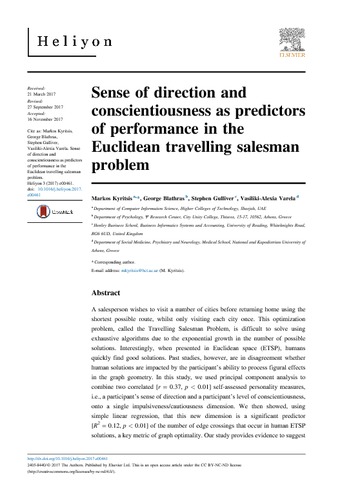 Kyritsis, M. orcid id iconORCID: https://orcid.org/0000-0002-7151-1698, Blathras, G., Gulliver, S. orcid id iconORCID: https://orcid.org/0000-0002-4503-5448 and Vasiliki-Alexia, V. (2017) Sense of direction and conscientiousness as predictors of performance in the Euclidean travelling salesman problem. Heliyon, 3 (11). e00461. ISSN 2405-8440 doi: 10.1016/j.heliyon.2017.e00461