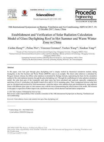 Zheng, C., Wu, P., Costanzo, V., Wang, Y. and Yang, X. (2017) Establishment and verification of solar radiation calculation model of glass daylighting roof in hot summer and warm winter zone in China. Procedia Engineering, 205. pp. 2903-2909. ISSN 1877-7058 doi: 10.1016/j.proeng.2017.10.089