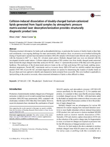 Collision-induced dissociation of doubly-charged barium-cationized lipids generated from liquid samples by atmospheric pressure matrix-assisted laser desorption/ionization provides structurally diagnostic product ions.