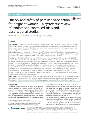 Furuta, M., Sin, J., Ng, E. S. W. and Wang, K. (2017) Efficacy and safety of pertussis vaccination for pregnant women - a systematic review of randomised controlled trials and observational studies. BMC Pregnancy and Childbirth, 17. 390. ISSN 1471-2393 doi: 10.1186/s12884-017-1559-2