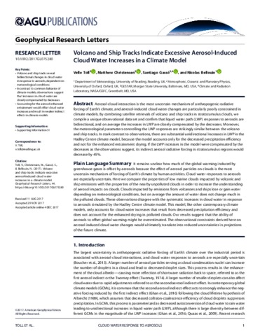 Volcano and ship tracks indicate excessive aerosol-induced cloud water increases in a climate model.