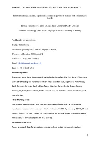 Halldorsson, B., Draisey, J., Cooper, P. and Creswell, C. (2018) Symptoms of social anxiety, depression and stress in parents of children with social anxiety disorder. British Journal of Clinical Psychology, 57 (2). pp. 148-162. ISSN 0144-6657 doi: 10.1111/bjc.12170