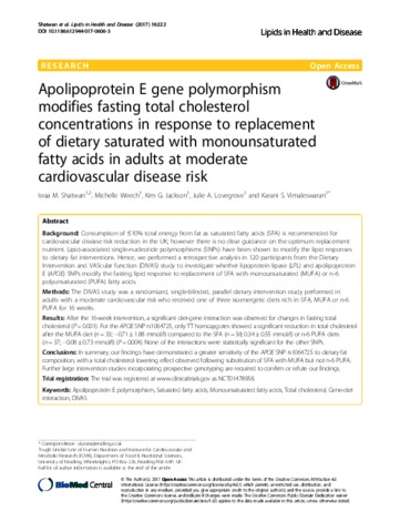 Apolipoprotein E gene polymorphism modifies fasting total cholesterol concentrations in response to replacement of dietary saturated with monounsaturated fatty acids in adults at moderate cardiovascular disease risk.