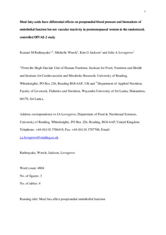 Rathnayake, K. M., Weech, M. orcid id iconORCID: https://orcid.org/0000-0003-1738-877X, Jackson, K. G. orcid id iconORCID: https://orcid.org/0000-0002-0070-3203 and Lovegrove, J. A. orcid id iconORCID: https://orcid.org/0000-0001-7633-9455 (2018) Meal fatty acids have differential effects on postprandial blood pressure and biomarkers of endothelial function but not vascular reactivity in postmenopausal women in the Randomized Controlled Dietary Intervention and VAScular function (DIVAS)-2 Study. Journal of Nutrition, 148 (3). pp. 348-357. ISSN 1541-6100 doi: 10.1093/jn/nxx042