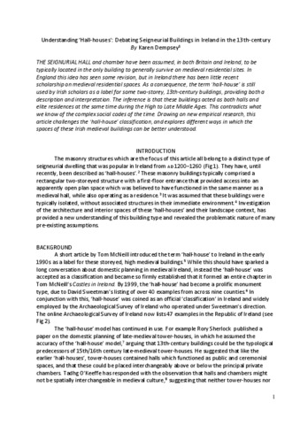 Dempsey, K. (2017) Understanding ‘Hall-Houses’: debating Seigneurial buildings in Ireland in the 13th Century. Medieval Archaeology, 61 (2). pp. 372-399. ISSN 0076-6097 doi: 10.1080/00766097.2017.1375183
