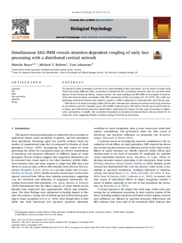 Bayer, M., Rubens, M. T. and Johnstone, T. (2018) Simultaneous EEG-fMRI reveals attention-dependent coupling of early face processing with a distributed cortical network. Biological Psychology, 132. pp. 133-142. ISSN 0301-0511 doi: 10.1016/j.biopsycho.2017.12.002