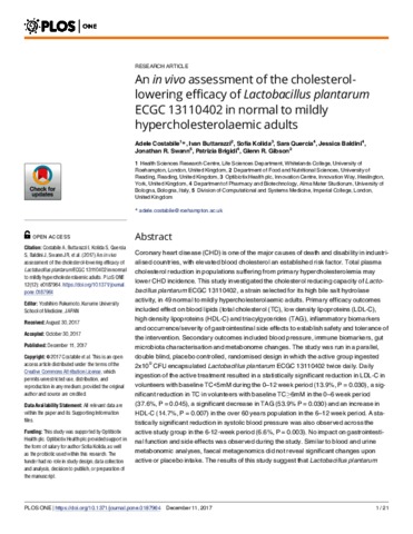 An in vivo assessment of the cholesterol-lowering efficacy of Lactobacillus plantarum ECGC 13110402 in normal to mildly hypercholesterolaemic adults.