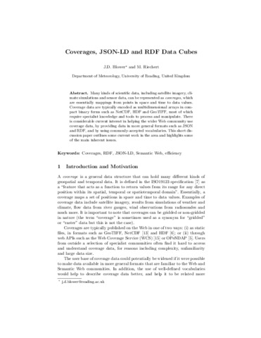 Blower, J. and Riechert, M. (2016) Coverages, JSON-LD and RDF data cubes. In: Workshop on Spatial Data on the Web (SDW 2016), 27-30 Sep 2016, Montreal, Canada.
