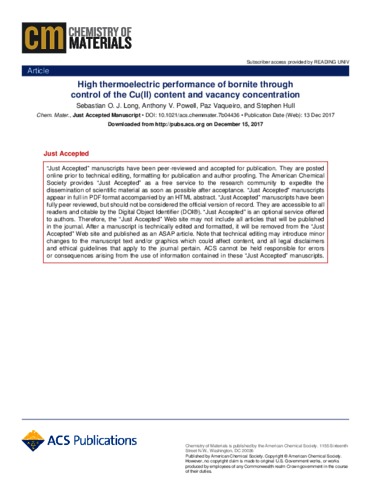 Long, S. O. J., Powell, A. V., Vaqueiro, P. orcid id iconORCID: https://orcid.org/0000-0001-7545-6262 and Hull, S. (2018) High thermoelectric performance of bornite through control of the Cu(II) content and vacancy concentration. Chemistry of Materials, 30 (2). pp. 456-464. ISSN 1520-5002 doi: 10.1021/acs.chemmater.7b04436