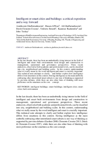 Ghaffarianhoseini, A., AlWaer, H., Ghaffarianhoseini, A., Clements-Croome, D., Berardi, U., Raahemifar, K. and Tookey, J. (2018) Intelligent or smart cities and buildings: a critical exposition and a way forward. Intelligent Buildings International Journal, 10 (2). pp. 122-129. ISSN 1750-8975 doi: 10.1080/17508975.2017.1394810