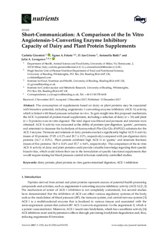 Giromini, C., Fekete, Á. A., Givens, D. I. orcid id iconORCID: https://orcid.org/0000-0002-6754-6935, Baldi, A. and Lovegrove, J. A. orcid id iconORCID: https://orcid.org/0000-0001-7633-9455 (2017) Short-communication: a comparison of the in vitro angiotensin-1-converting enzyme inhibitory capacity of dairy and plant protein supplements. Nutrients, 9 (12). 1352. ISSN 2072-6643 doi: 10.3390/nu9121352
