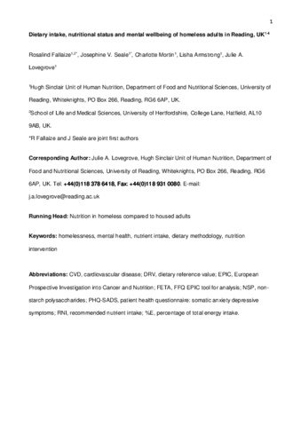 Dietary intake, nutritional status and mental wellbeing of homeless adults in Reading, UK.