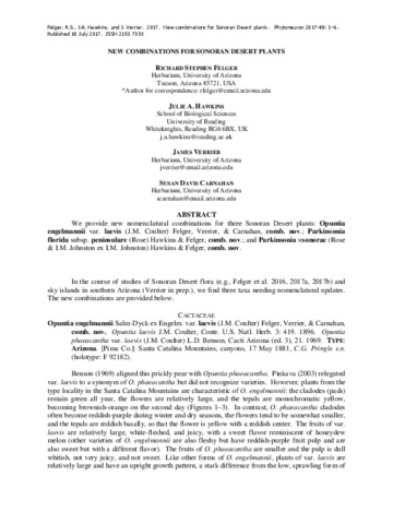 We provide new nomenclatural combinations for three Sonoran Desert plants: Opuntia engelmannii var. laevis (J.M. Coulter) Felger, Verrier, & Carnahan, comb. nov.; Parkinsonia florida subsp. peninsulare (Rose) Hawkins & Felger, comb. nov.; and Parkinsonia ×sonorae (Rose & I.M. Johnston ex I.M. Johnston) Hawkins & Felger, comb. nov.