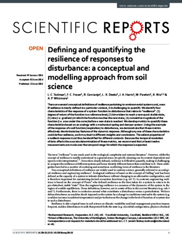Todman, L. C. orcid id iconORCID: https://orcid.org/0000-0003-1232-294X, Fraser, F. C., Corstanje, R., Deeks, L. K., Harris, J. A., Pawlett, M., Ritz, K. and Whitmore, A. P. (2016) Defining and quantifying the resilience of responses to disturbance: a conceptual and modelling approach from soil science. Scientific Reports, 6 (1). 28426. ISSN 2045-2322 doi: 10.1038/srep28426