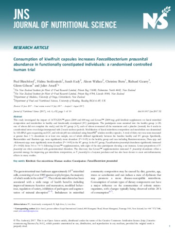 Blatchford, P., Stoklosinski, H., Eady, S., Wallace, A., Butts, C., Gearry, R., Gibson, G. orcid id iconORCID: https://orcid.org/0000-0002-0566-0476 and Ansell, J. (2017) Consumption of kiwifruit capsules increases Faecalibacterium prausnitzii abundance in functionally constipated individuals: a randomised controlled human trial. Journal of Nutritional Science, 6. e52. ISSN 2048-6790 doi: 10.1017/jns.2017.52