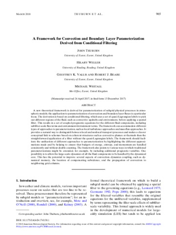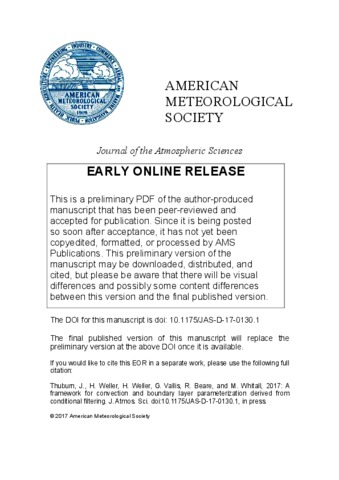 Thuburn, J., Weller, H. orcid id iconORCID: https://orcid.org/0000-0003-4553-7082, Vallis, G. K., Beare, R. J. and Whitall, M. (2018) A framework for convection and boundary layer parameterization derived from conditional filtering. Journal of the Atmospheric Sciences, 75 (3). pp. 965-981. ISSN 1520-0469 doi: 10.1175/jas-d-17-0130.1