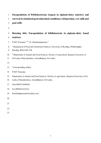 Encapsulation of Bifidobacterium longum in alginate-dairy matrices and survival in simulated gastrointestinal conditions, refrigeration, cow milk and goat milk.