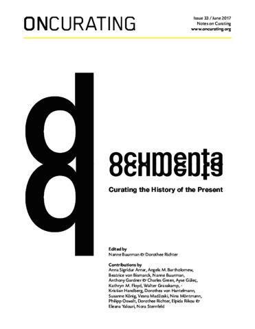 On the occasion of documenta’s 14th edition, this special issue scrutinizes the ways in which the Kassel-based periodic exhibition has been contributing to curating the history of the present since its inception in 1955. From diverse perspectives, the authors engage with questions of how documenta’s iterations played a significant role not only in the making of a history of contemporary art but also in the canon of the relatively young field of curatorial and exhibition studies. Focusing on documenta’s engagement with artistic and broader cultural developments, as well as its implication in shifting socioeconomic and geopolitical contexts, the texts assembled in this issue touch upon documenta’s continuous dedication to instituting and reconfiguring the contemporary throughout its history. Its characteristic dedication to contemporaneity and institutional temporariness have continuously challenged researchers to reflect and revise their methodologies and epistemological foundations. Due to documenta’s specific character as a recurring large-scale exhibition with a relatively stable framework that has to be reinterpreted anew every five years, documenta’s potentials for mediating ideologies and power structures, notions of authorship and agency, as well as relations between the local and the global have furthermore fueled negotiations of the relationship of art and politics from the outset. The texts in this issue call attention to how it not only scripted paradigmatic models of subjectivity but also gradually widened its scope from a Eurocentric vision to a more worldly frame of reference, provoking reflections on its role in the globalization of the arts and its entanglement in (neo)colonial and (neo)liberal power relations in capitalism at large. Nanne Buurman, Dorothee Richter (eds.), Documenta Issue, www.on-curating.org # 33, Zürich 2017, ISBN-13: 978-1546946120 with contributions by Kathryn M. Floyd, Phillipp Oswalt, Susanne König, Kristian Handberg, Vesna Madzoski, Walter Grasskamp, Beatrice von Bismarck, Dorothea von Hantelmann, Nanne Buurman, Dorothee Richter, Anthony Gardner/Charles Green, Nina Möntmann, Nora Sternfeld, Elpida Rikou/Eleana Yalouri, Angela M. Bartholomew, Anna Sigridur Arnar