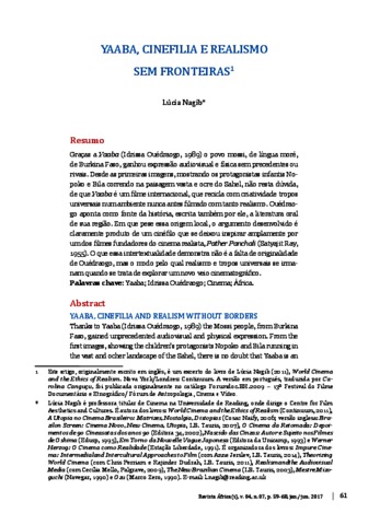 Nagib, L. orcid id iconORCID: https://orcid.org/0000-0001-8808-9748 (2017) Yaaba, cinefilia e realismo sem fronteiras. Revista África(s), 4 (7). pp. 61-70. ISSN 2446-7375