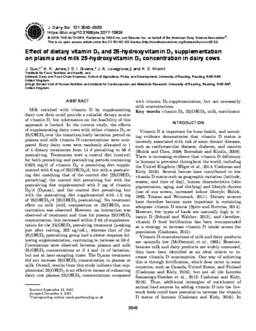 Guo, J., Jones, A. K., Givens, D. I. orcid id iconORCID: https://orcid.org/0000-0002-6754-6935, Lovegrove, J. A. orcid id iconORCID: https://orcid.org/0000-0001-7633-9455 and Kliem, K. E. orcid id iconORCID: https://orcid.org/0000-0002-0058-8225 (2018) Effect of dietary vitamin D3 and 25-hydroxyvitamin D3 supplementation on plasma and milk 25-hydroxyvitamin D3 concentration in dairy cows. Journal of Dairy Science, 101 (4). pp. 3545-3553. ISSN 0022-0302 doi: 10.3168/jds.2017-13824