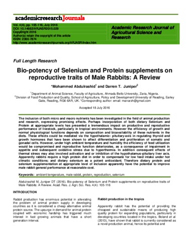 Abdulrashid, M. and Juniper, D. T. (2016) Bio-potency of Selenium and Protein supplements on reproductive traits of male rabbits: a review. Academic Research Journal of Agricultural Science and Research, 4 (4). pp. 105-116. ISSN 2360-7874 doi: 10.14662/ARJASR2015.029