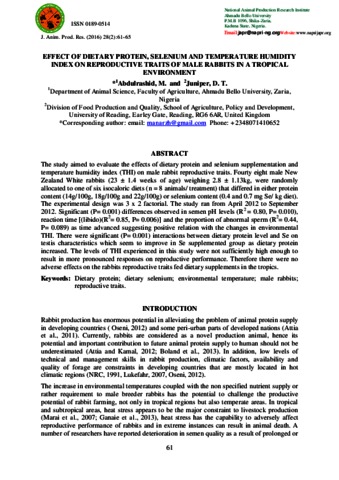 Abdulrashid, M. and Juniper, D. T. (2016) Effect of dietary protein, selenium and temperature humidity index on reproductive traits of male rabbits in a tropical environment. Journal of Animal Production Research, 28 (2). pp. 61-75. ISSN 0189-0514