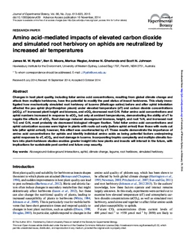 Amino acid-mediated impacts of elevated carbon dioxide and simulated root herbivory on aphids are neutralized by increased air temperatures.