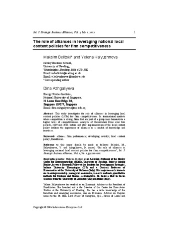 This study investigates the role of alliances in leveraging local content policies (LCPs) for firm competitiveness. In international markets where competition is strong, firms that are part of a group may demonstrate a higher level of competitiveness. Analysis of Kazakhstani firms over two periods, 2009 and 2013, before and after implementation of the local content policy outlines the importance of alliances as a conduit of knowledge and resources.