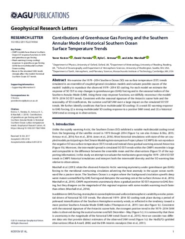 Contributions of greenhouse gas forcing and the Southern Annular Mode to historical Southern Ocean surface temperature trends.