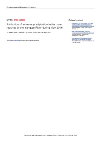 Attribution of extreme precipitation in the lower reaches of the Yangtze River during May 2016.