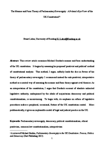 This review article examines Michael Gordon's manner and form understanding of the UK constitution. It begins by assessing his proposed 'positivist and political' method of constitutional analysis. This method, I argue, unfairly loads the dice in favour of his theory of parliamentary sovereignty. I recommend instead the anti-positivist, interpretative method as a neutral way of assessing the manner and form theory against rival theories. As an interpretation of the constitution, I argue that Gordon's account of absolute unlimited legislative authority, underpinned by the ideals of majoritarian democracy and political constitutionalism, is unconvincing. To begin with, its emphasis on reform of legislative procedures makes a peripheral, occasional, feature of the UK constitution central. More problematically, it gives an implausible model of legal and judicial practice in the UK.