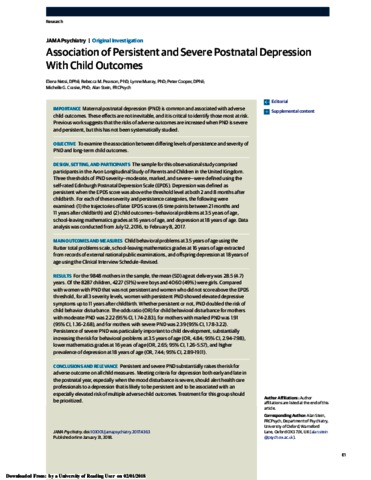 Netsi, E., Pearson, R. M., Murray, L., Cooper, P., Craske, M. G. and Stein, A. (2018) Association of persistent and severe postnatal depression with child outcomes. JAMA Psychiatry, 75 (3). pp. 247-253. ISSN 2168-6238 doi: 10.1001/jamapsychiatry.2017.4363