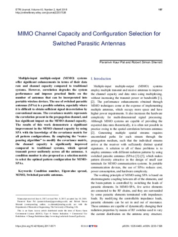 MIMO channel capacity and configuration selection for switched parasitic antennas.