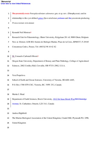 Mertens, K. N., Carbonell-Moore, M. C., Pospelova, V., Head, M. J., Highfield, A., Schroeder, D., Gu, H., Andree, K. B., Fernandez, M., Yamaguchi, A., Takano, Y., Matsuoka, K., Nézan, E., Bilien, G., Okolodkov, Y., Koike, K., Hoppenrath, M., Pfaff, M., Pitcher, G., Al-Muftah, A., Rochon, A., Lim, P. T., Leaw, C. P., Lim, Z. F. and Ellegaard, M. (2018) Pentaplacodinium saltonense gen. et sp. nov. (Dinophyceae) and its relationship to the cyst-defined genus Operculodinium and yessotoxin-producing Protoceratium reticulatum. Harmful algae, 71. pp. 57-77. ISSN 1878-1470 doi: 10.1016/j.hal.2017.12.003
