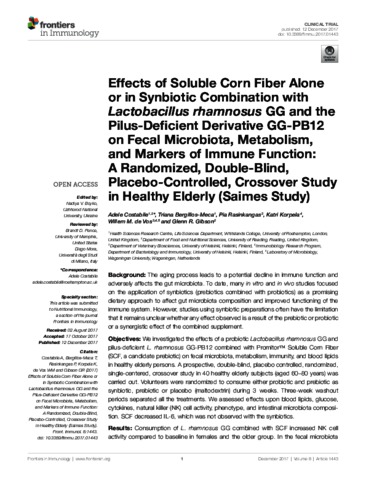 Background: The aging process leads to a potential decline in immune function and adversely affects the gut microbiota. To date, many in vitro and in vivo studies focused on the application of synbiotics (prebiotics combined with probiotics) as a promising dietary approach to affect gut microbiota composition and improved functioning of the immune system. However, studies using synbiotic preparations often have the limitation that it remains unclear whether any effect observed is a result of the prebiotic or probiotic or a synergistic effect of the combined supplement. Objectives: We investigated the effects of a probiotic Lactobacillus rhamnosus GG and pilus-deficient L. rhamnosus GG-PB12 combined with PromitorTM Soluble Corn Fiber (SCF, a candidate prebiotic) on fecal microbiota, metabolism, immunity, and blood lipids in healthy elderly persons. A prospective, double-blind, placebo controlled, randomized, single-centered, crossover study in 40 healthy elderly subjects (aged 60–80 years) was carried out. Volunteers were randomized to consume either probiotic and prebiotic as synbiotic, prebiotic or placebo (maltodextrin) during 3 weeks. Three-week washout periods separated all the treatments. We assessed effects upon blood lipids, glucose, cytokines, natural killer (NK) cell activity, phenotype, and intestinal microbiota composi- tion. SCF decreased IL-6, which was not observed with the synbiotics. results: Consumption of L. rhamnosus GG combined with SCF increased NK cell activity compared to baseline in females and the older group. In the fecal microbiota analyses, the strongest community shifts were due to L. rhamnosus GG combined with SCF and SCF treatments. L. rhamnosus GG combined with SCF and L. rhamnosus GG-PB12 combined with SCF significantly increased the genus Parabacteroides. L. rhamnosus GG combined with SCF and SCF increased concentrations of Ruminococcaceae Incertae Sedis. Oscillospira and Desulfovibrio slightly decreased in the L. rhamnosus GG combined with SCF group, whereas Desulfovibrio decreased also in the L. rhamnosus GG-PB12 combined with SCF group. L. rhamnosus GG combined with SCF reduced total cholesterol and LDL-cholesterol in volunteers with initially ele- vated concentrations. C-reactive protein significantly decreased during L. rhamnosus GG-PB12 combined with SCF intervention compared to baseline. Conclusion: In conclusion, the synbiotic combination of L. rhamnosus GG with SCF showed a tendency to promote innate immunity by increasing NK cell activity in elderly women and in 70 to 80-year-old volunteers and decreased TC and LDL-c in hyper- cholesterolemic patients. In addition, L. rhamnosus GG-PB12 combined with SCF demonstrated an increase in NK cell activity compared to SCF alone in older volunteers. We also found significant positive effects on the immune response, evidenced by a decrease of the pro-inflammatory cytokine IL-6. Therefore, dietary intervention with L. rhamnosus GG combined with SCF could be of importance in elderly as an attractive option for enhancement of both the microbial and immune systems.