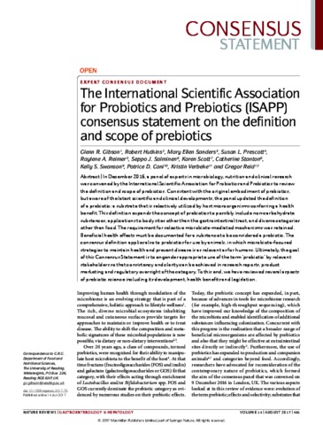 Gibson, G. R. ORCID: https://orcid.org/0000-0002-0566-0476, Hutkins, R., Sanders, M. E., Prescott, S. L., Reimer, R. A., Salminen, S. J., Scott, K., Stanton, C., Swanson, K. S., Cani, P. D., Verbeke, K. and Reid, G.
