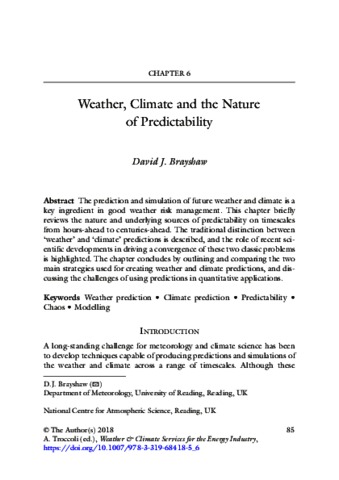 Brayshaw, D. orcid id iconORCID: https://orcid.org/0000-0002-3927-4362 (2018) Weather, climate and the nature of predictability. In: Weather & Climate Services for the Energy Industry. Palgrave Pivot, Basingstoke, pp. 85-95. ISBN 9783319684178 doi: 10.1007/978-3-319-68418-5_6