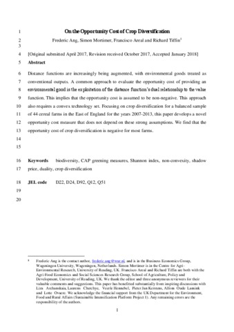 Distance functions are increasingly being augmented, with environmental goods treated as conventional outputs. A common approach to evaluate the opportunity cost of providing an environmental good is the exploitation of the distance function's dual relationship to the value function. This implies that the opportunity cost is assumed to be non‐negative. This approach also requires a convex technology set. Focusing on crop diversification for a balanced sample of 44 cereal farms in the East of England for the years 2007–2013, this paper develops a novel opportunity cost measure that does not depend on these strong assumptions. We find that the opportunity cost of crop diversification is negative for most farms.