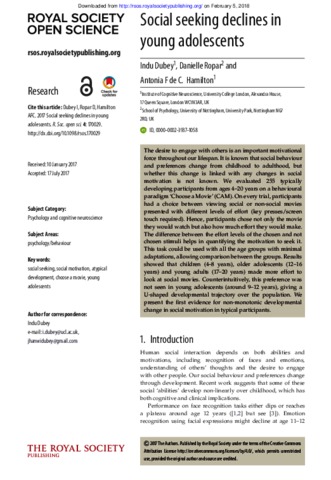 Dubey, I., Ropar, D. and Hamilton, A. F. d. C. (2017) Social seeking declines in young adolescents. Royal Society Open Science. ISSN 2054-5703 doi: 10.1098/rsos.170029