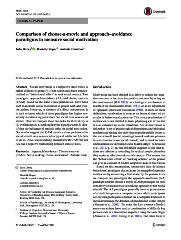 Dubey, I., Ropar, D. and Hamilton, A. (2018) Comparison of choose-a-movie and approach-avoidance paradigms used to measure social motivation. Motivation and Emotion, 42 (2). pp. 190-199. ISSN 1573-6644 doi: 10.1007/s11031-017-9647-1
