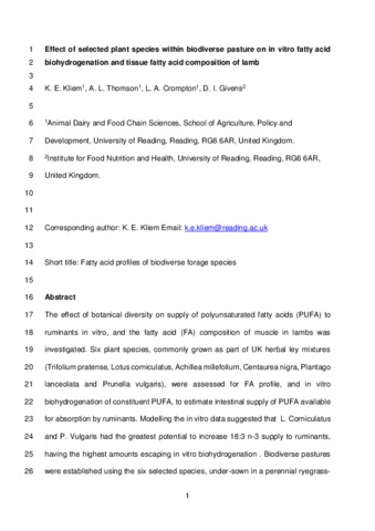 Effect of selected plant species within biodiverse pasture on in vitro fatty acid biohydrogenation and tissue fatty acid composition of lamb