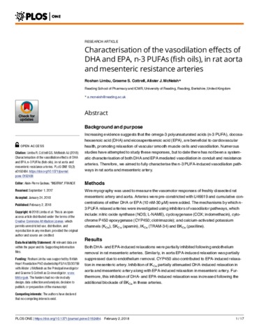 Characterisation of the vasodilation effects of DHA and EPA, n-3 PUFAs (fish oils), in rat aorta and mesenteric resistance arteries.