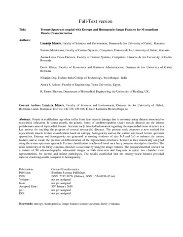 Texture spectrum coupled with entropy and homogeneity image features for myocardium muscle characterization.