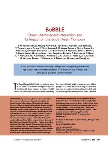 Vinayachandran, P. N., Matthews, A. J., Kumar, K. V., Sanchez-Franks, A., Thushara, V., George, J., Vijith, V., Webber, B. G. M., Queste, B. Y., Roy, R., Sarkar, A., Baranowski, D. B., Bhat, G. S., Klingaman, N. P. orcid id iconORCID: https://orcid.org/0000-0002-2927-9303, Peatman, S. C., Parida, C., Heywood, K. J., Hall, R., Kent, B., King, E. C., Nayak, A. A., Neema, C. P., Amol, P., Lotliker, A., Kankonkar, A., Gracias, D. G., Vernekar, S., Souza, A. C. D., Valluvan, G., Pargaonkar, S. M., Dinesh, K., Giddings, J. and Joshi, M. (2018) BoBBLE: ocean-atmosphere interaction and its impact on the South Asian monsoon. Bulletin of the American Meteorological Society, 99 (8). pp. 1569-1587. ISSN 1520-0477 doi: 10.1175/BAMS-D-16-0230.1