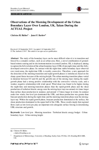 Halios, C. H. orcid id iconORCID: https://orcid.org/0000-0001-8301-8449 and Barlow, J. F. (2018) Observations of the morning development of the urban boundary layer over London, UK, taken during the ACTUAL project. Boundary-Layer Meteorology, 166 (3). pp. 395-422. ISSN 0006-8314 doi: 10.1007/s10546-017-0300-z